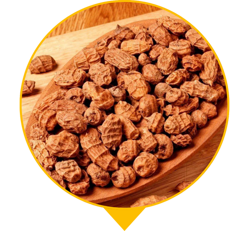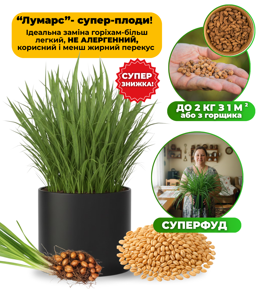 “Лумарс” — це рослина, що під землею формує дрібні їстівні бульби з природною солодкістю та легким горіховим смаком. Ідеальна заміна горіхам не викликає алергії! Вони схожі на маленькі корисні горішки, які можна їсти сирими, підсушеними, додавати в йогурт, каші, смузі або перемелювати на солодке “борошно” для корисних десертів. Це натуральний продукт без хімії, який багатий на клітковину та енергію.