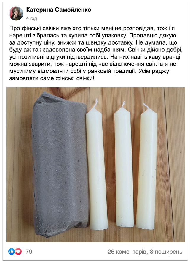 Фінська технологія довго горючих свічок - не нова. Вона існує більше 100 років, але особливої актуальності для українців набула саме в період аварійних відключень світла. Раніше наша компанія спеціалізувалася на виготовленні ароматичних свічок для створення затишку в домі, але які часи – такі і пріоритети.