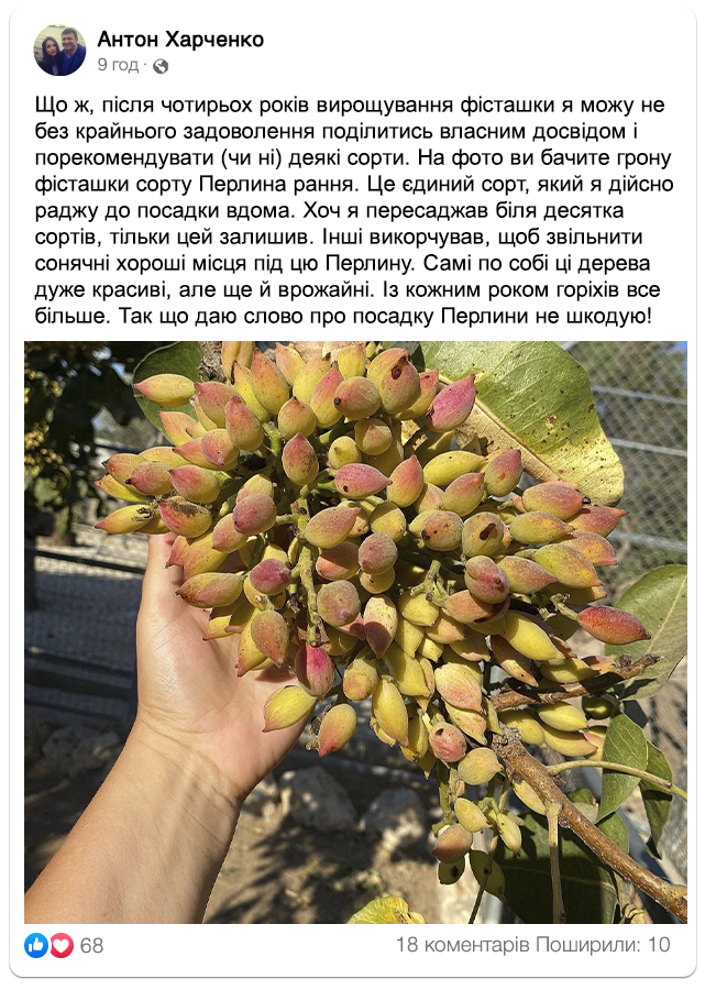 «Перлина рання» – високоврожайний та найбільший за розміром сорт фісташок, створений агрономами розплідника «Горіхи Світу» Валентиною та Михайлом Турченко.